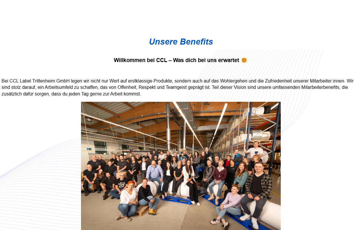 CCL entwickelt und produziert Etiketten und Label im Getränke- und Lebensmittelsegment. Die positive Zusammenarbeit im Unternehmen wird hoch bewertet, was in den Benefits für Mitarbeitende deutlich wird.