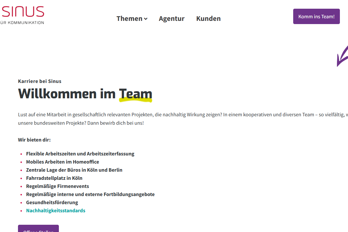 Das SINUS Büro für Kommunikation ist spezialisiert auf dialogische Kommunikation in Veranstaltungsform und arbeitet rund um die Themenbereiche Prävention, Bildung, Gesundheit und Soziales. Die Zusammenarbeit des Teams wird als ein Benefit für die Arbeit bei SINUS hervorgehoben.